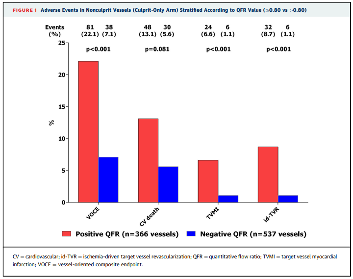 1.在仅治疗罪犯病变组中,在685 名患者的 903 条非罪犯血管上测量了QFR,其中366 例 (40.5%) 非罪犯血管的 QFR值≤0.80,其中 VOCE 的发生率显着更高(22.1% vs 7.1%;P < 0.001)见图2