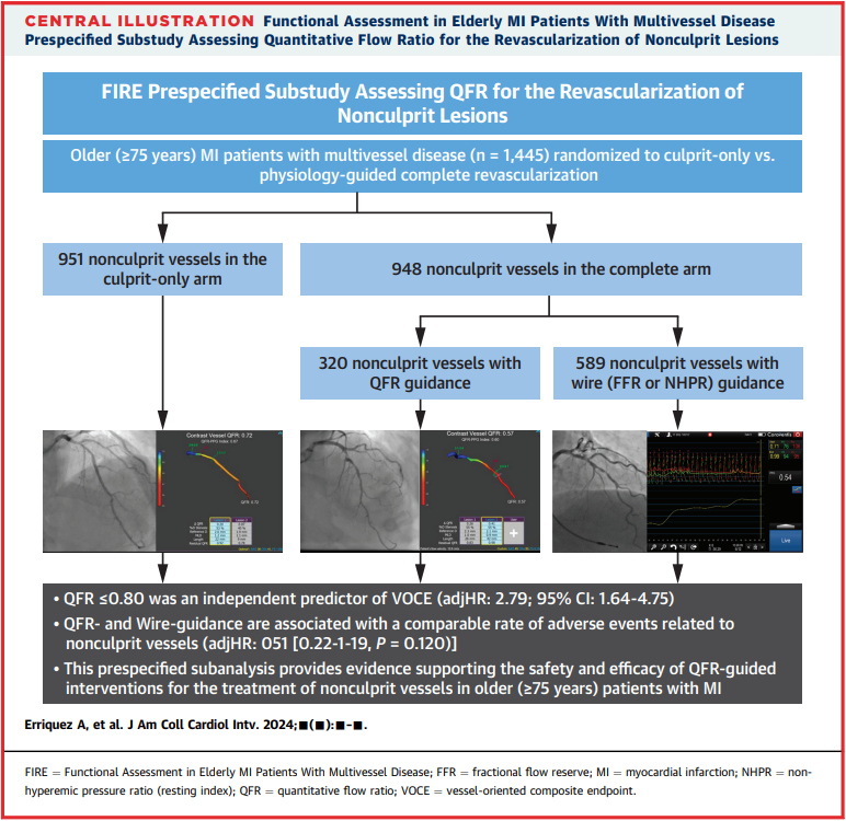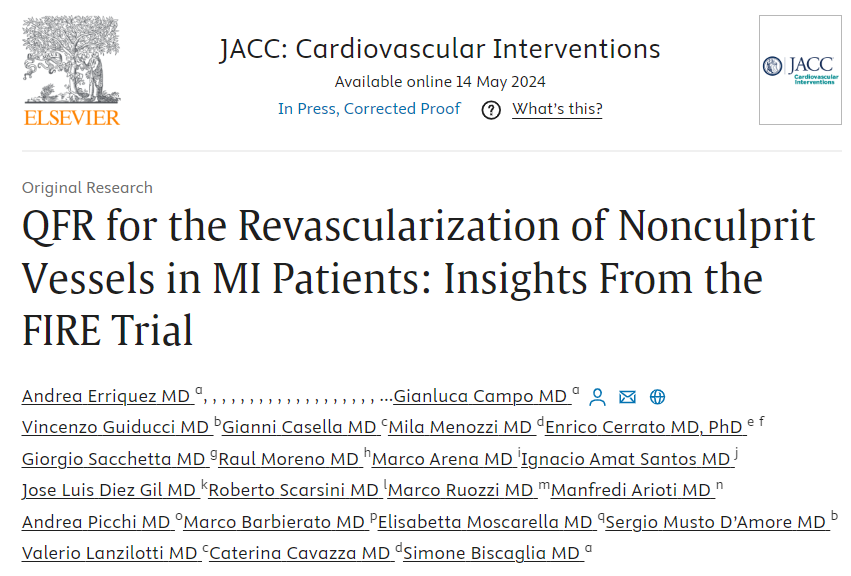 1.Erriquez A, Campo G, Guiducci V, Casella G, Menozzi M, Cerrato E, Sacchetta G, Moreno R, Arena M, Amat Santos I, Diez Gil JL, Scarsini R, Ruozzi M, Arioti M, Picchi A, Barbierato M, Moscarella E, Musto D'Amore S, Lanzilotti V, Cavazza C, Rezzaghi M, Cocco M, Marrone A, Verardi FM, Escaned J, Barbato E, Colaiori I, Pesenti N, Carrara G, Biscaglia S. QFR for the Revascularization of Nonculprit Vessels in MI Patients: Insights From the FIRE Trial. JACC Cardiovasc Interv. 2024 May 3:S1936-8798(24)00691-5. doi: 10.1016/j.jcin.2024.04.022. Epub ahead of print. PMID: 38752972.