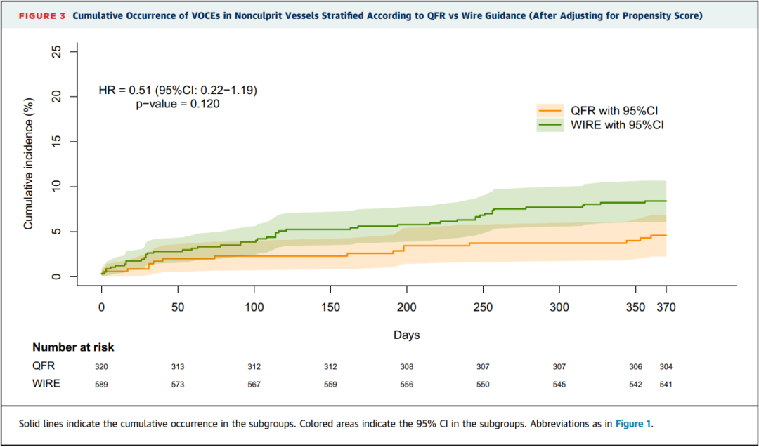 3.在基于生理功能学指导的完全血运重建组中,QFR与FFR两者与非罪犯血管相关的不良事件发生率相当(HR:0.57;95%CI:0.28-1.15)见图3、4